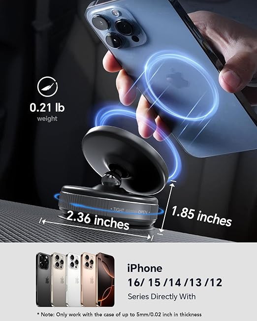 [سازگاری گسترده] این نگهدارنده تلفن مغناطیسی خلاء با سری آیفون 16 15 14 13 12 (iPhone 8-11 با قاب Magsafe) سازگار است. و قاب گوشی مجهز به مغناطیسی برای تلفنها یا کیسهای بدون ویژگیهای مغناطیسی، این لوازم جانبی تلفن شامل یک حلقه فلزی است که میتواند به داخل قاب گوشی متصل شود و از سازگاری جهانی اطمینان حاصل کند. برای چسبندگی بهینه، اجازه دهید تا 24 ساعت پس از اتصال ثابت شود. توجه: فقط با ضخامت 5 میلی متر/0.02 اینچ کار کنید.