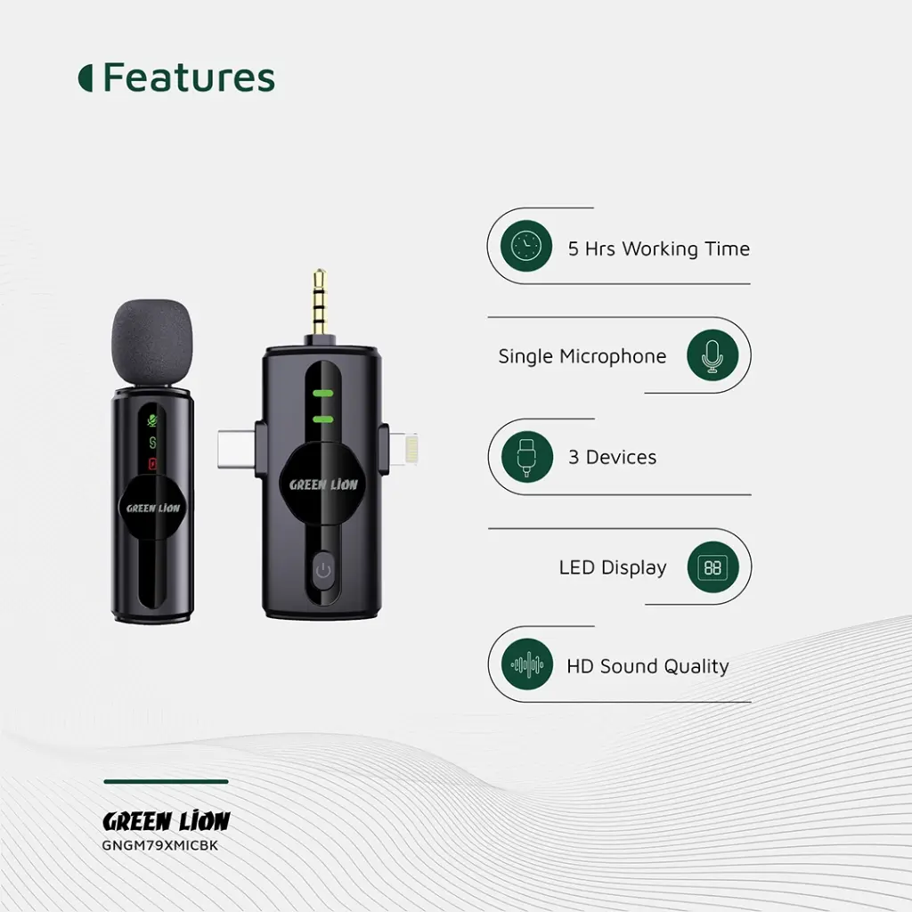 میکروفون حذف نویز سه کاره Green Lion به عنوان یک راهکار صوتی جامع، همه کاره است که صدا و خروجی واضح و شفافی را ارائه میدهد. پلاستیک ABS بادوام، آن را با یک میکروفون کندانسور با کیفیت بالا که در داخل برای دریافتهای واضح تعبیه شده است، ساخته است. این میکروفون با یک باتری ۶۵ میلیآمپر ساعتی در گیرنده و ۲۲۰ میلیآمپر ساعتی در میکروفون تغذیه میشود و عمر باتری آن تا ۵ ساعت و شارژ سریع ۱ تا ۱.۵ ساعت از طریق پورت Type-C را ارائه میدهد. با SNR بالای ≥۷۵ دسیبل و باند پاسخ فرکانسی ۲۰ هرتز تا ۲۰ کیلوهرتز، صدای با کیفیت HD ارائه میدهد، از این رو برای استفاده در کاربردهای مختلف مناسب است. دریافت ۳۶۰ درجه همه جهته و تأخیر بسیار کم ≤۳۰ میلیثانیه آن، امکان نظارت در زمان واقعی و ارتباط بدون وقفه را فراهم میکند. همچنین حالت Reverb، قابلیت اتصال و پخش و یک صفحه نمایش LED با کاربرد آسان نیز وجود دارد. با برد انتقال ۲۰ متری، قابلیت اطمینان و انعطافپذیری را برای همه کاربردهای شما ارائه میدهد.